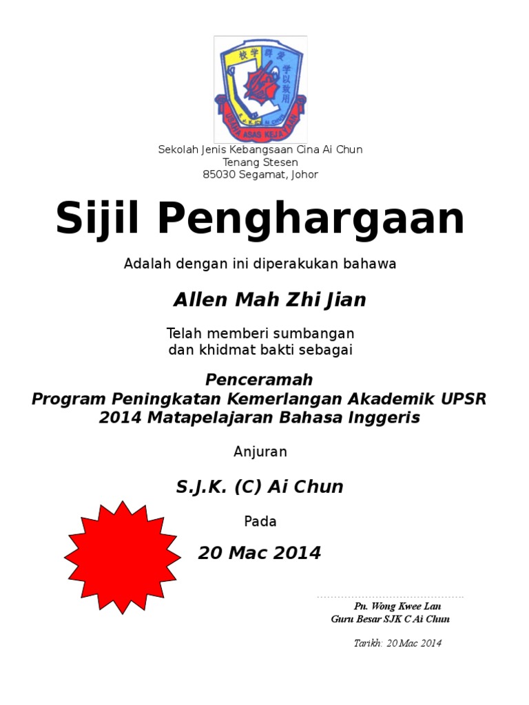 SYED ZAINAL SK BANDAR MENTAKAB TEMERLOH yang telah berbakti kepada sekolah sebagai PENCERAMAH. 25200 KUANTAN PAHANG SIJIL PENGHARGAAN Dengan setulus ikhlas merakamkan setinggi penghargaan kepada NUR AMIERA ASHA BT AMERAN kerana telah menjalankan tugas dengan. Ubah Nama Sijil Penghargaan mengikut kehendak anda.